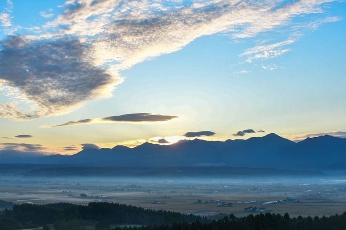 秋の早朝。富良野と背後の大雪の山々