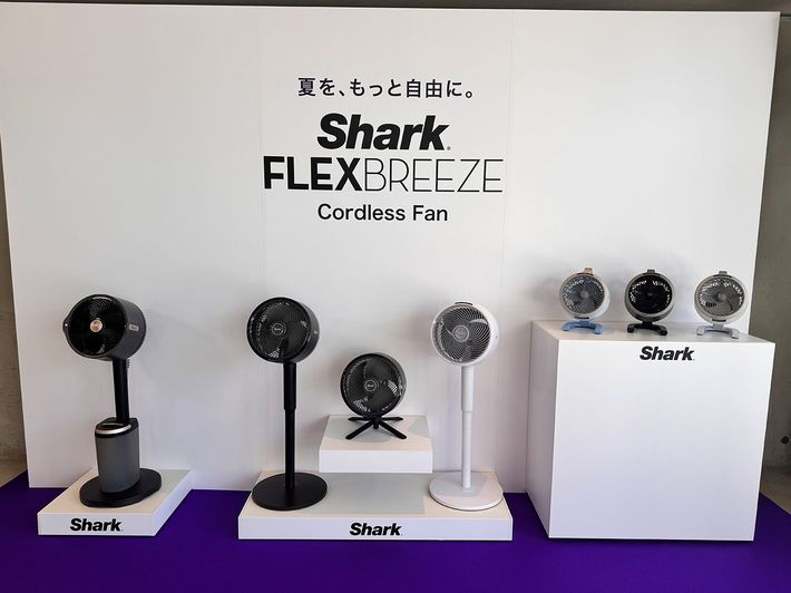 左から水タンク搭載の「FlexBreeze ProMist」(直販価格3万4980円)、ミスト機能が追加できる「Shark FlexBreeze」(直販価格2万9700円)、室内で使えるドライミストが涼しい「Shark FlexBreeze HydroGo」(直販価格1万9800円)を用意