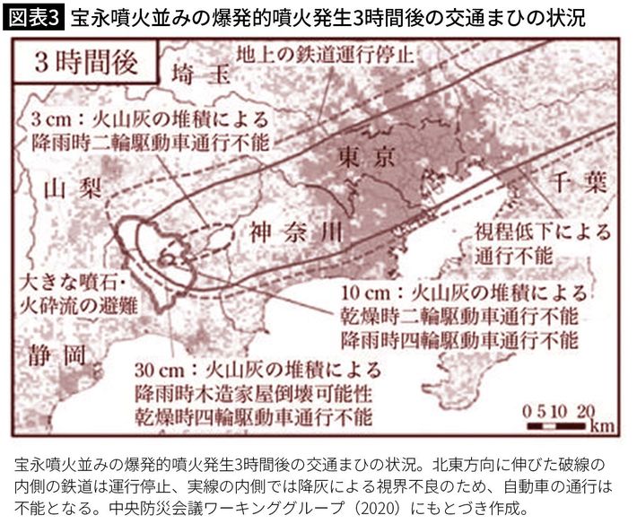 火山灰が10センチ積もると道路は走行不能になり、0.5ミリメートル積もると鉄道は運行停止、1cm積もると上下水道は機能停止する(「