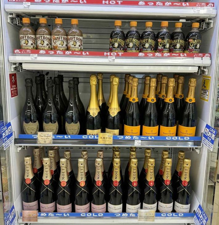 ローソンニセコひらふ店の飲み物売り場。コーヒーの下にシャンパンがずらり(画像=筆者提供)