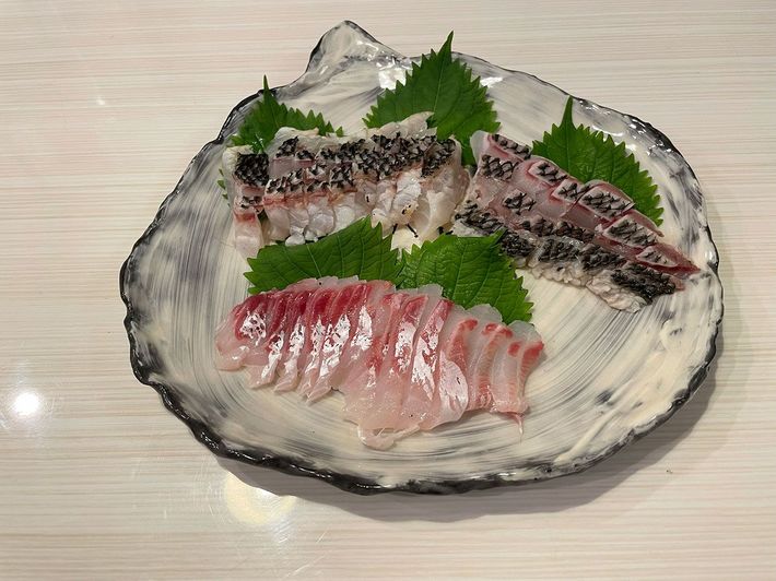 クロダイの刺身3種盛り。同じ魚だとは思えないほど味わいが異なります