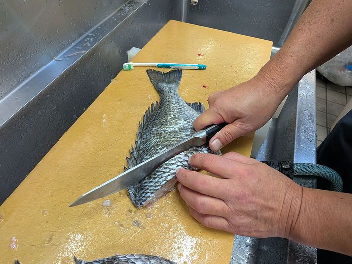 半身のクロダイを骨ごと切り分けています。大人向けの豪快な水炊きしゃぶしゃぶ用です