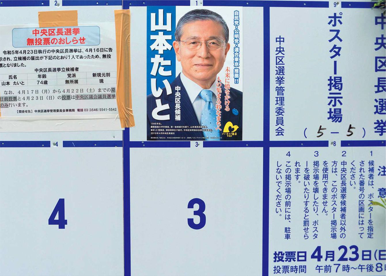 2023年の統一地方選にて、東京都中央区長選挙の無投票を知らせる掲示。地方選挙では立候補者の減少により、無投票当選や定員割れも散見されるが、その対策としての議員歳費増額に、飯島氏は反対の立場を示した。