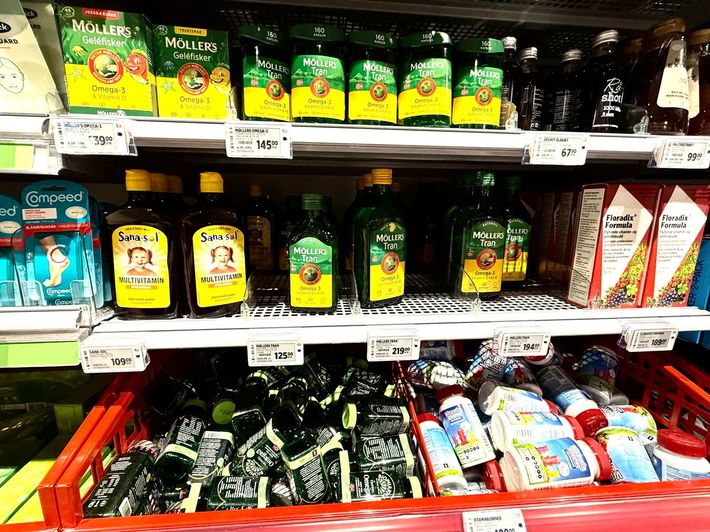 ビタミンDやオメガ3の商品がずらりと並ぶ。子どもでも摂取しやすいように、フルーツ味のジェル、