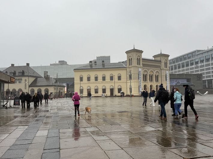 2025年11月23日のオスロ市内。奥にある建物はノーベル平和センター。この日は雨でどんよりした日曜日。写真は一切の編集をしておらず、これが11月の雨の日、最も「明るい時間帯」だ。北欧の冬で青空+太陽は珍しく、この灰色の空が日常となる。