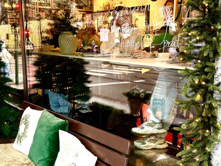 カフェの窓ガラスに書かれているメッセージは「店内でヒュッゲなおしゃべり(en hyggelig prat)を。クリスマスの飾り、凝ったインテリア、コーヒー、カフェ、シナモンロール、照明、友達との時間など、ヒュッゲのヒントはこの1枚に結構詰まっている。