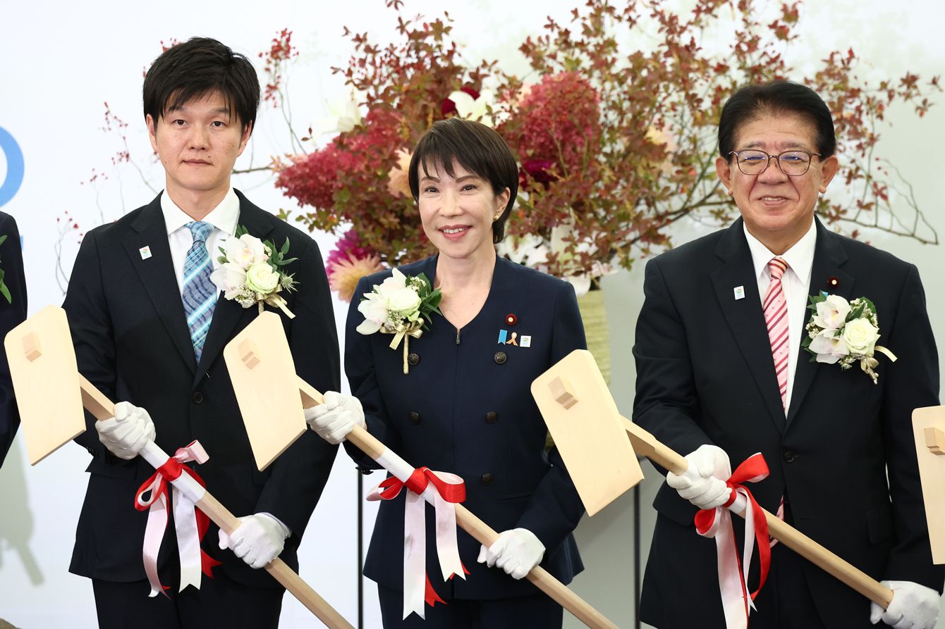 2027年国際園芸博覧会(花博)」の日本政府出展起工式で、記念撮影に臨む(左から)鈴木憲和農林水産相、高市早苗首相、金子恭之=2025年11月2日、横浜市瀬谷区