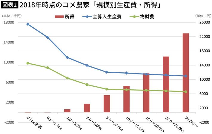 出所=農林水産省「農業経営統計調査」より筆者作成。注=所得(左目盛り、単位:千円)および生産費(右目盛り、単位:円)は、米価が安定していた2018年のものを使用