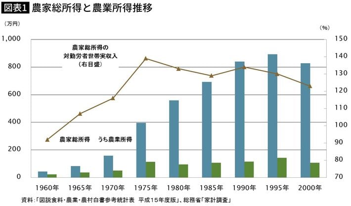 農業所得だけでなく、給与所得を得る(兼業化する)ことで所得が上がっていることがわかる。これが農家の所得が上がっても、農業が衰退した理由。