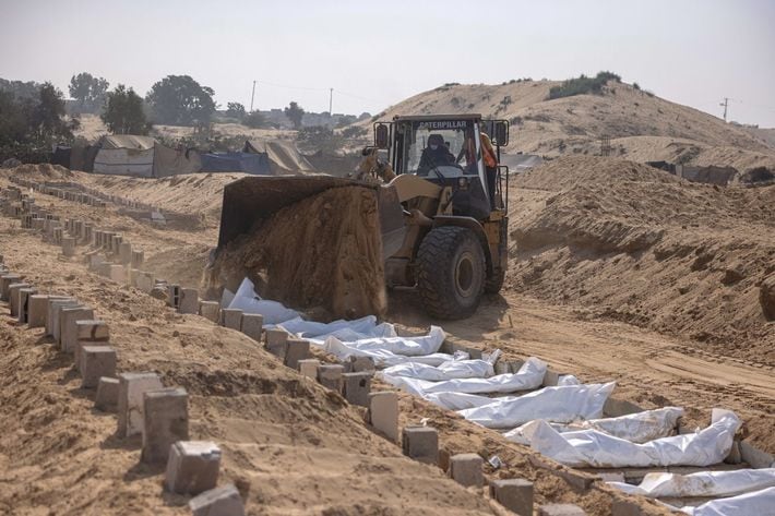 2025年11月10日、ガザ地区南部のハーン・ユーニスにある墓地。医療従事者と民間人作業員がパレスチナ人の集団埋葬を実施