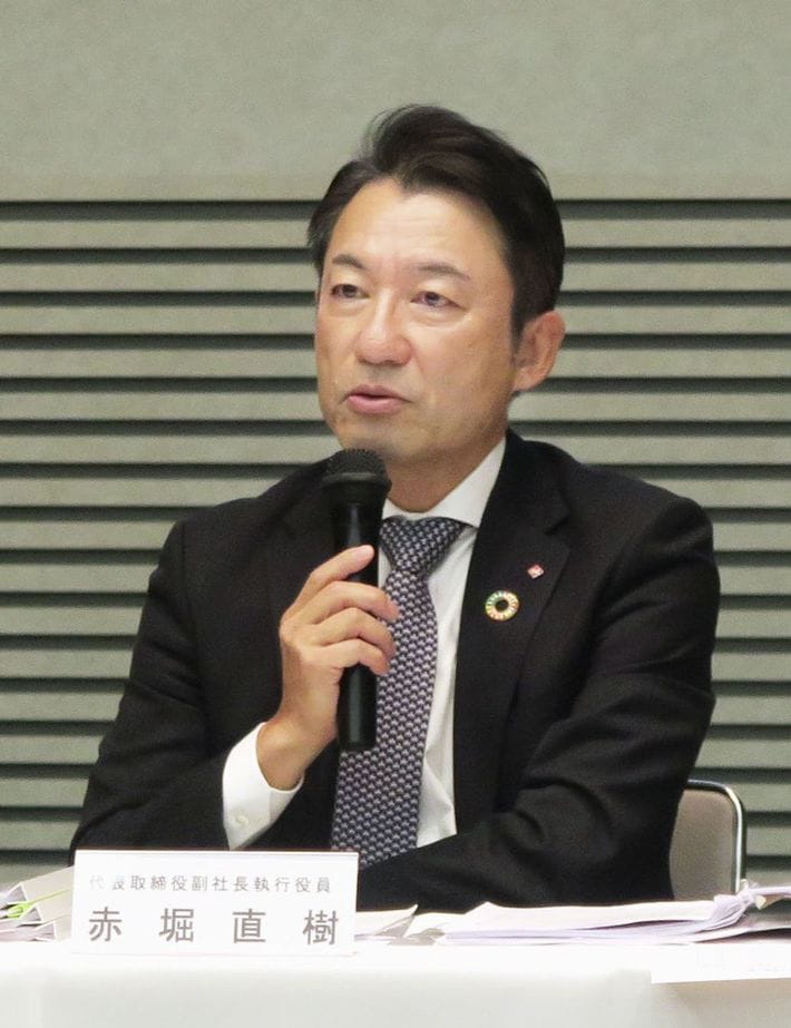 記者会見する日本生命保険の赤堀直樹副社長=2025年11月20日午後、東京都千代田区