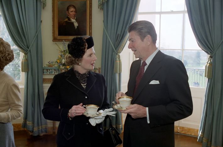フォークランド紛争前年の1981年2月の訪米の際、ホワイトハウスでロナルド・レーガン米大統領と語り合うサッチャー英首相(肩書はいずれも当時、1981年2月26日)(写真=