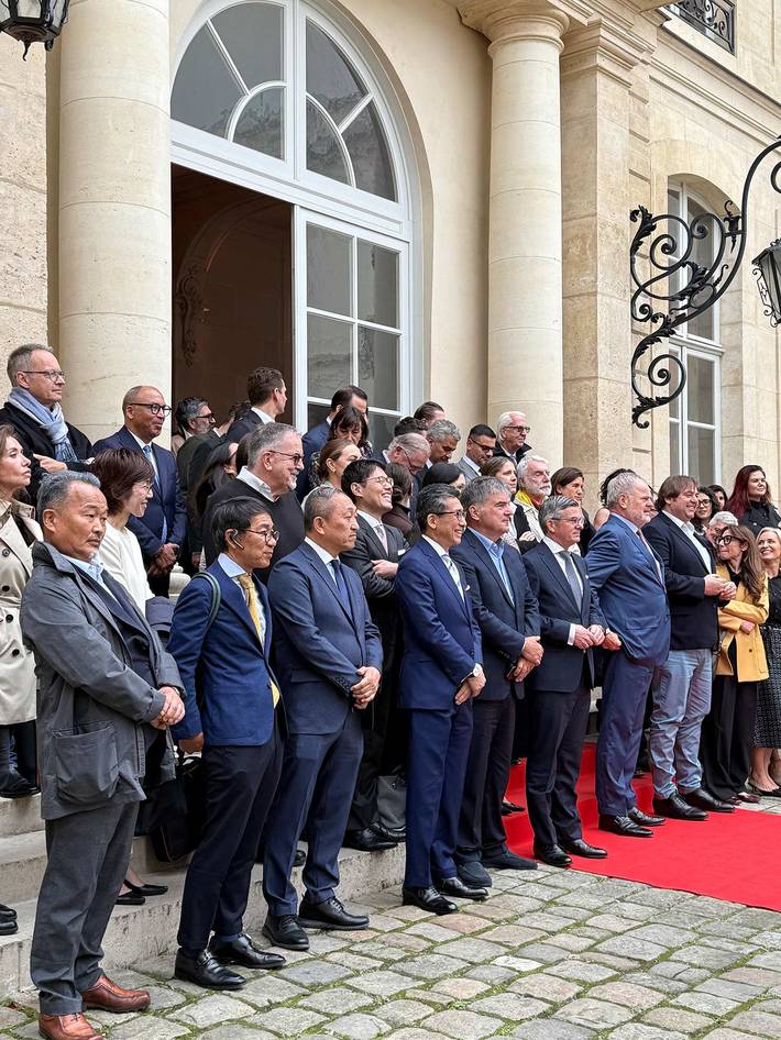 2025年10月8日(日本時間9日)にパリで開催された「ミシュランキー」授賞式の様子。壇上に並ぶホテリエ(ホテル従事者)たちは一様に素晴らしく姿勢がいいのが印象的。眼鏡姿の笑顔の男性は「パレスホテル 東京」の渡部支配人。