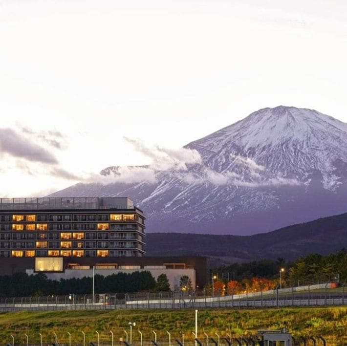 富士山と富士スピードウェイに挟まれるようにして建つ「富士スピードウェイホテル」。レースが開催される日は、愛好家たちで客室が埋まるという。