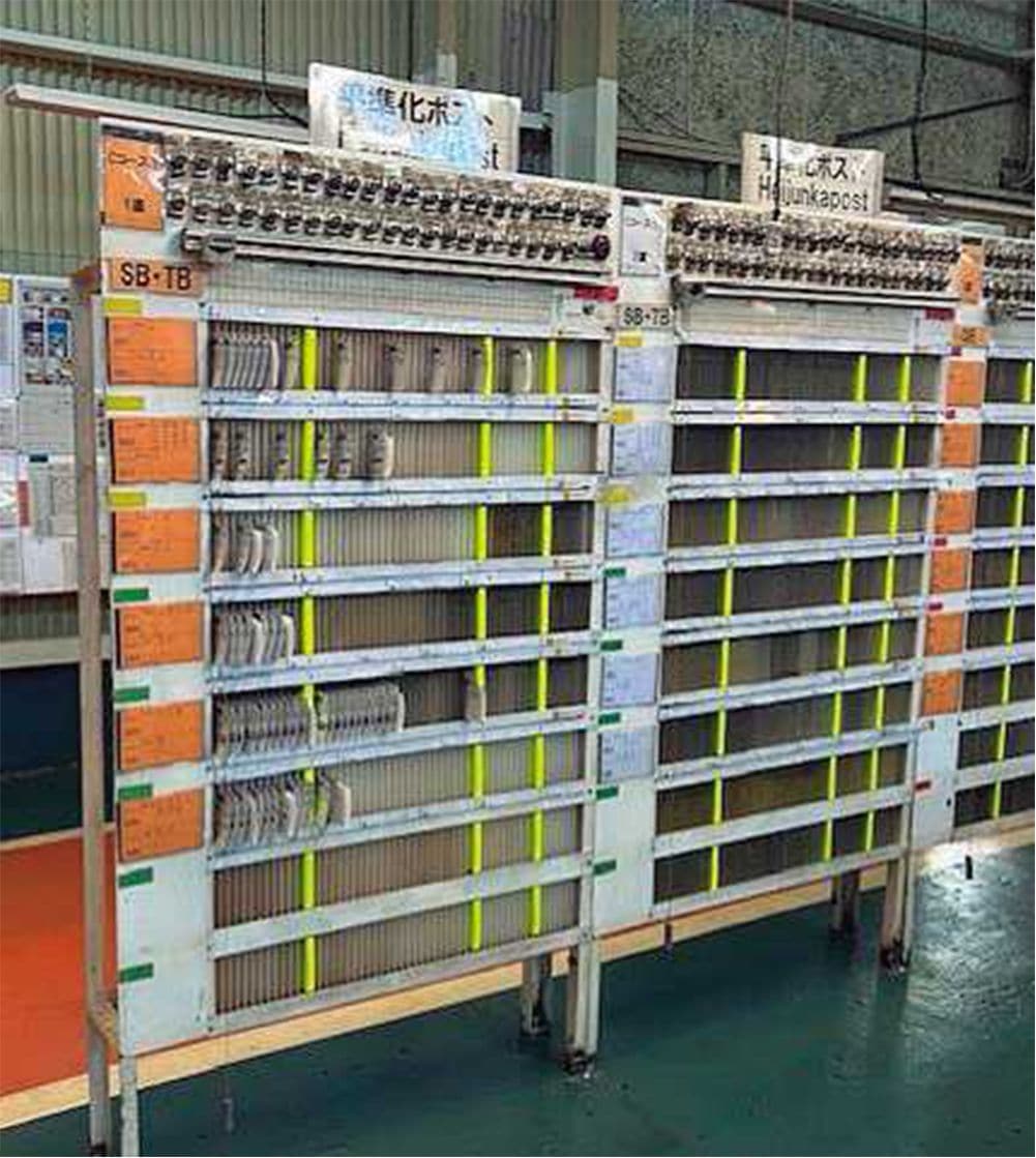 「平準化ポスト」の様子。かんばんの動きを確認することで現場の状況を把握し、無駄のない作業のための人員配置などを行えるようになる。