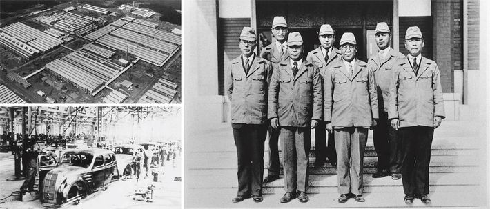 挙母工場竣工にあたり、当時の役員が集合した。前列右から二番目が喜一郎である。1938年に挙母工場は完成。ボデーの組み立てラインは現在の本社工場でも面影を残す。
