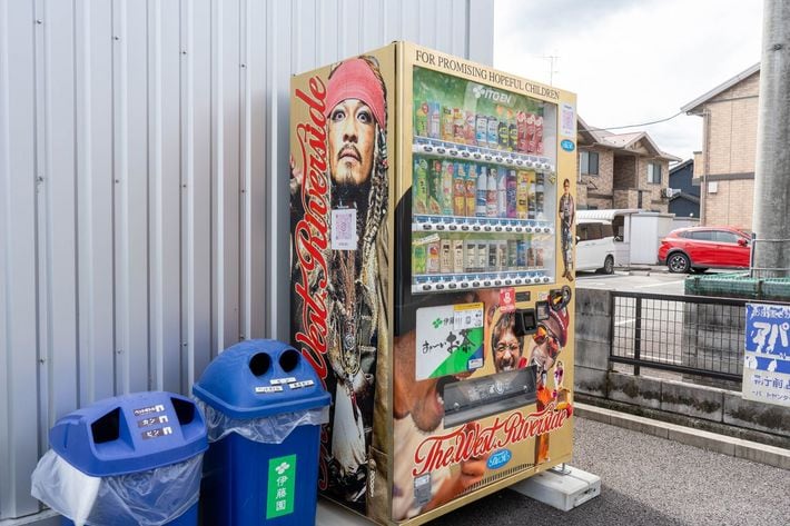 仮装した坂口さんの写真などでデコレーションされていた自動販売機。回収した缶やペットボトルはB型就労所の人たちのお給料に。また、自動販売機の売上の一部は若者への支援金に充てている