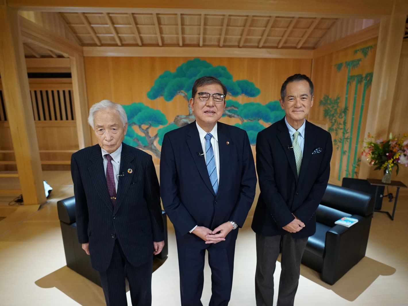RSK本社にある能舞台で収録を行った(左から)小長氏、石破氏、春川氏。収録は、能舞台保護のため予め床板の上に養生を施した状態で収録を行った。(12月29日16時追記)