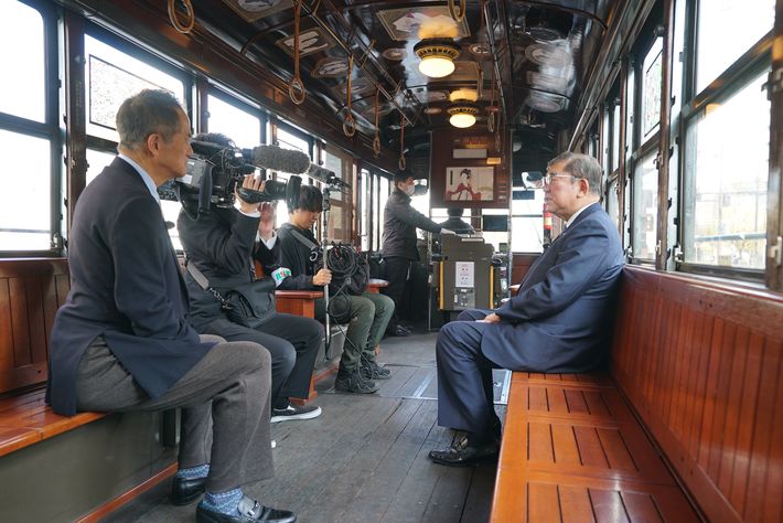 岡山市内を走る「岡電」内で石破前総理に取材する春川氏。