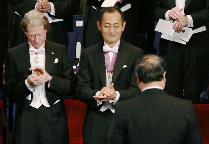 ノーベル賞授賞式で、笑顔を見せる山中伸弥京都大教授(中央)=2012年12月10日午後、ストックホルムのコンサートホール(代表撮影)