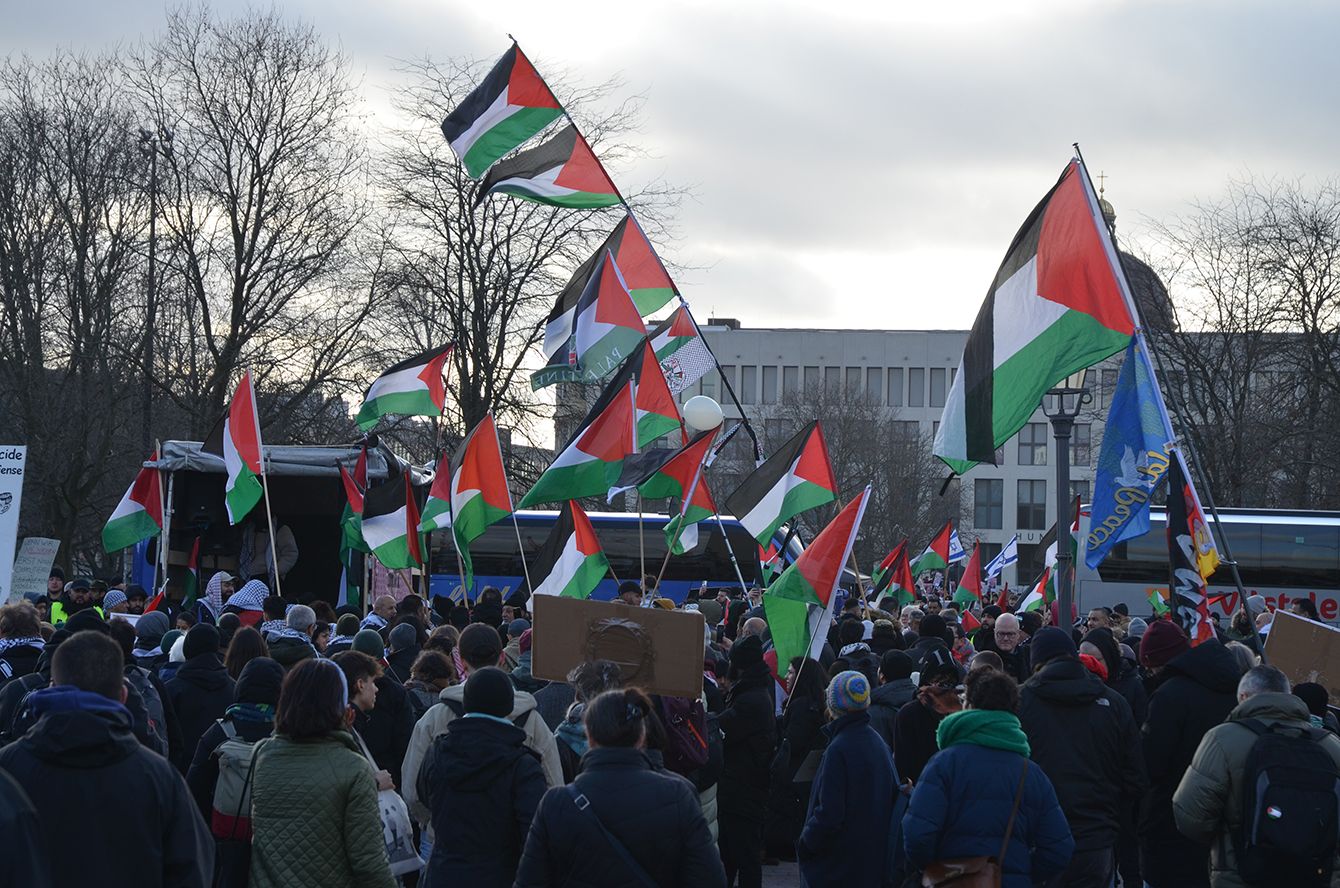 ベルリン中心部の公園でパレスチナの旗などを掲げて、「自由を」と声を上げる人たち(出典=『