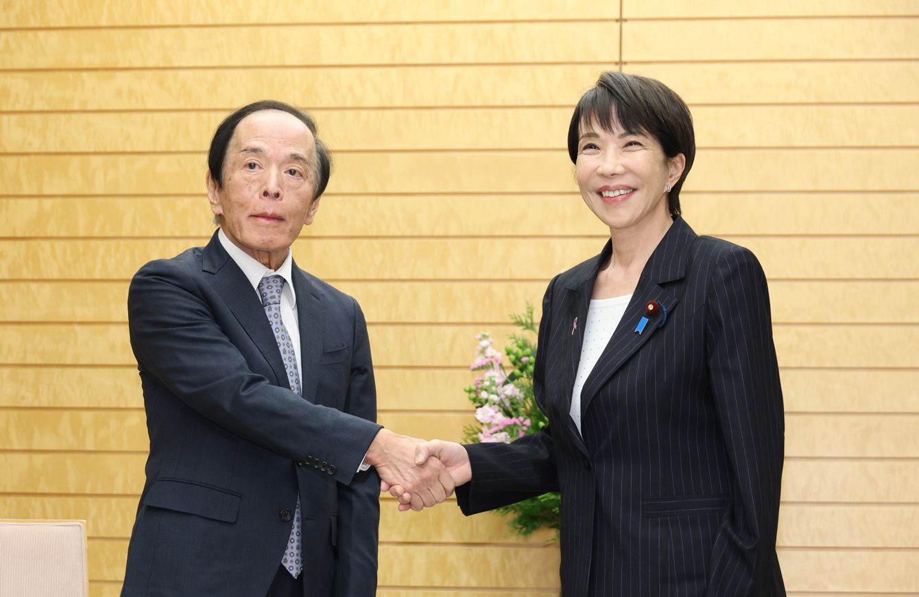 会談を前に握手する高市早苗首相(右)と日本銀行の植田和男総裁=2025年11月18日、首相官邸