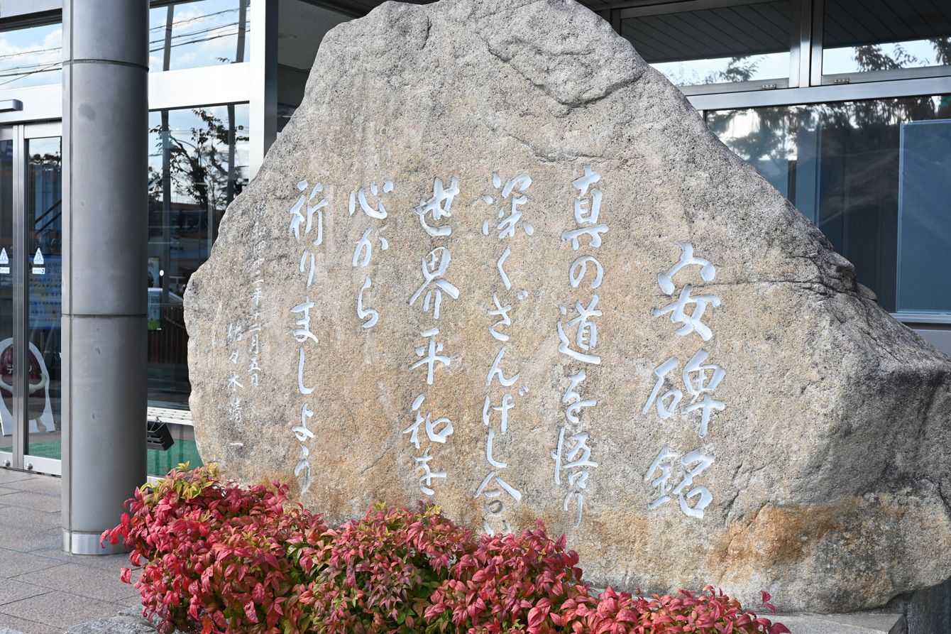 本社前にある、創業者・佐々木清一氏の言葉を刻んだ碑。戦争によって大きな被害を受けた広島発の企業としての思いが書かれている。