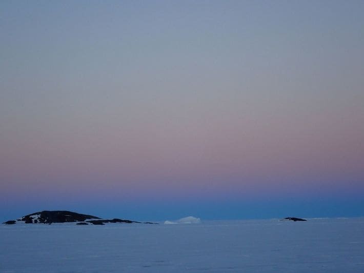 地平線の近くに薄青く映し出される「地球影」。大気が澄んでいて地平線が見渡せる南極では晴れた日は必ず見ることができる。