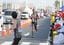 平塚中継所をトップでたすきをつなぐ東京国際大3区のビンセント・イエゴン(左は東京国際大4区・佐伯涼)=2020年1月2日、神奈川県平塚市