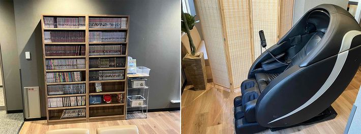 客室フロアを出たフリースペースに置かれたコミックの棚とマッサージチェア
