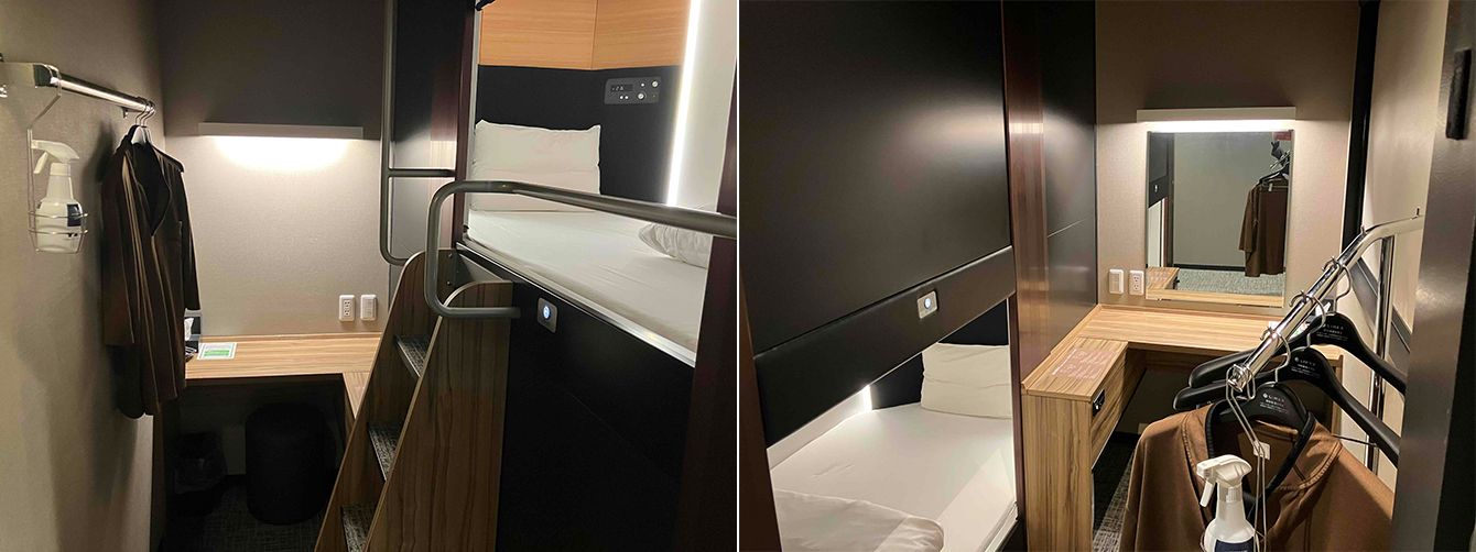 キャビンタイプの左の部屋(ベッドは上)と右の部屋(ベッドは下)。2つの部屋は壁で仕切られている。デスクとイスでは仕事もできる