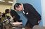 記者会見の冒頭で謝罪する、いわき信用組合の金成茂理事長(右)ら=2025年10月31日午後、福島県いわき市