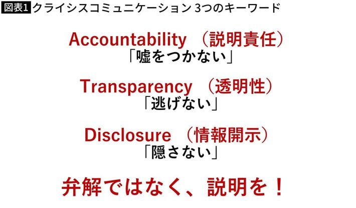 「危機対応」を評価する際に重要な3つのポイント。記者会見では。ここに「キーメッセージ」と「企業姿勢」を含めた5つのポイントが重要となる