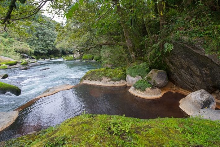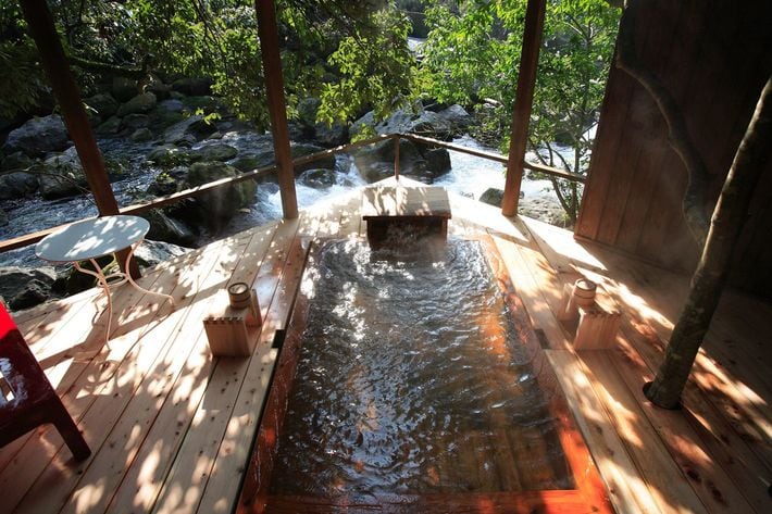 天降川の渓流を眺めながら楽しめる露天風呂。天然の保湿成分といわれるメタケイ酸を豊富に含む炭酸水素塩泉の泉質が、「美人の湯」といわれるゆえん。