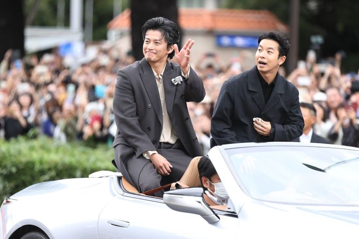 名古屋まつりでのNHK大河ドラマ「豊臣兄弟!」の織田信長役・小栗旬(左)、豊臣秀長役・仲野太賀。2025年10月19日、名古屋市