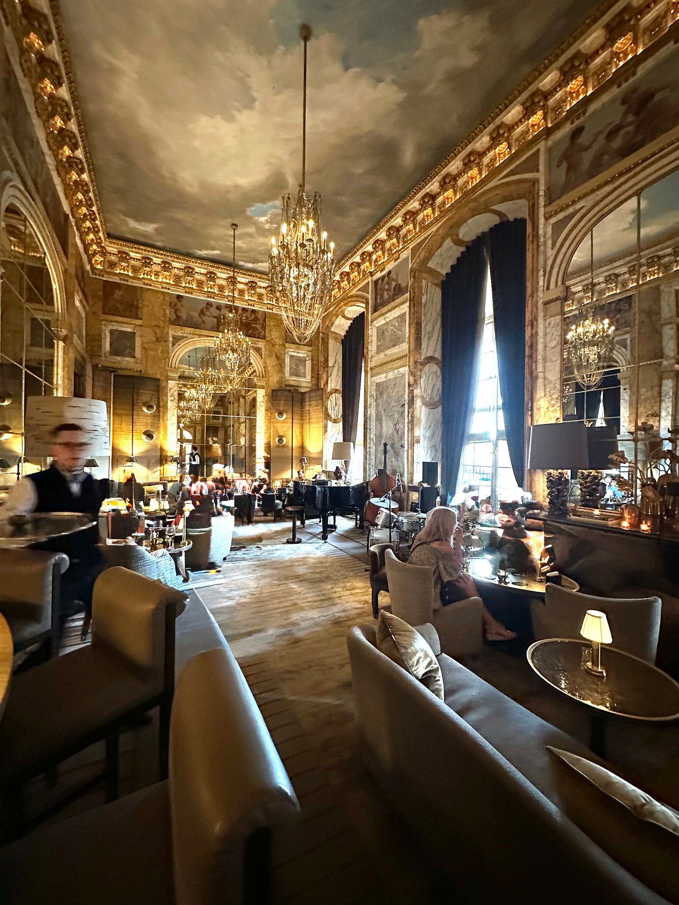 「ブルガリ バー」を特徴づけている、バーカウンター背景のタイル画に注目。随所にハイジュエリーブランドならではの意匠が満載で、人が少ない平日の午後や、年末年始などは狙い目だ。