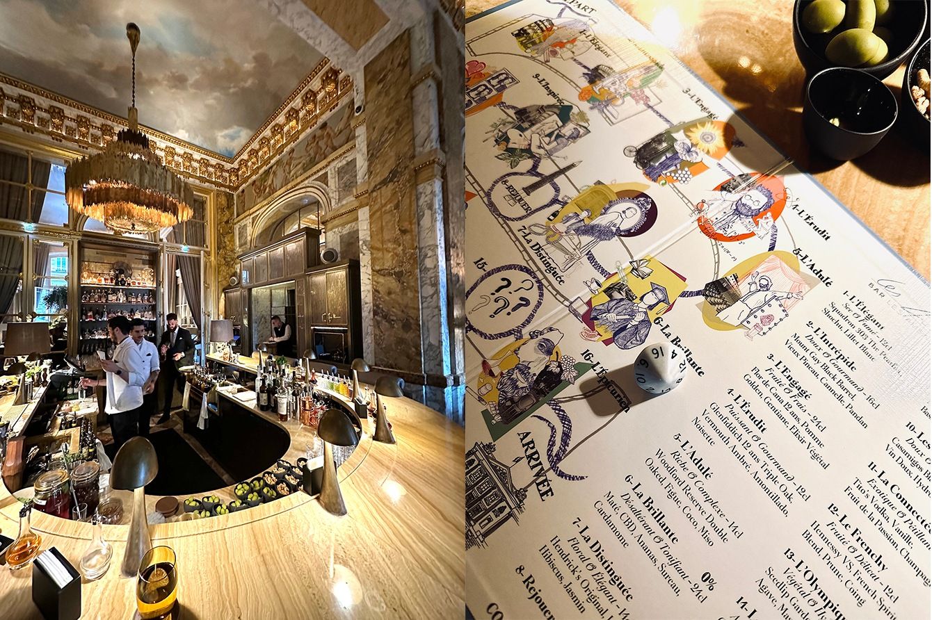 「オテル・ド・クリヨン」1階の「バー レ・アンバサドゥールズ」のU字カウンター。バーというより、もはや宮殿だ。右はメニュー表。渡されたサイコロ(中央)で決めるのも粋だ。