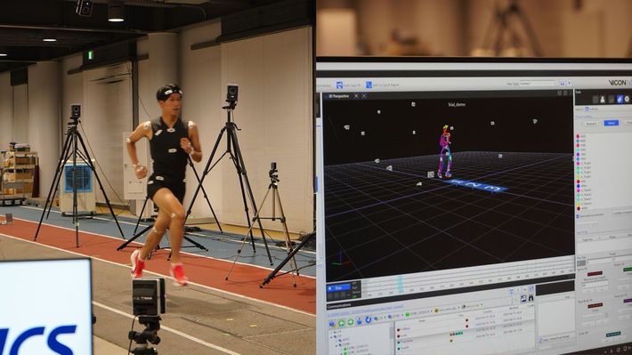 アシックススポーツ工学研究所。計測専用カメラ「モーションキャプチャー」でランナーの動きを分析する。地面には着地したときの衝撃を測る「地面反力計」も埋め込まれている。