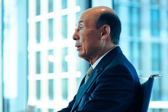 インタビューに応じるアシックス廣田康人会長。アシックス東京支社にて。