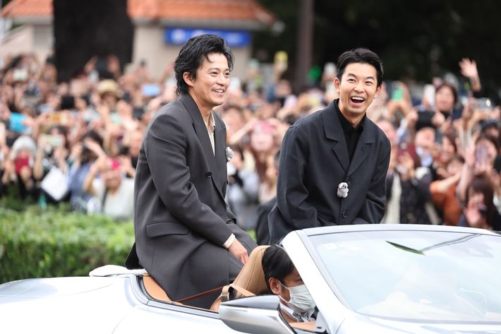 名古屋まつりでパレードに参加した2026年NHK大河ドラマ「豊臣兄弟!」の豊臣秀長役の仲野太賀さんと織田信長役の小栗旬さん。2025年10月19日、名古屋市