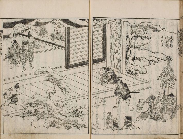 『絵本太功記』に描かれた信長の草履を温める逸話。国文学研究資料館所蔵(出典=国書データベース)