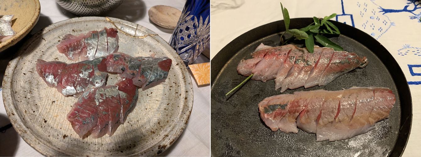 写真左)メアジの刺身。マアジよりもさっぱりした味わいで食感は強め。生姜醤油が合います/写真右)ムロアジの刺身は柔らかくて少しクセがあります。青唐辛子醤油との相性がバッチリでした