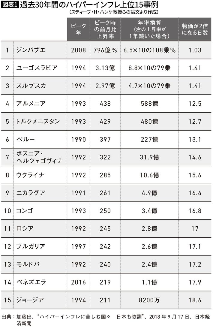 【図表1】過去30年間のハイパーインフレ上位15事例(図表=『