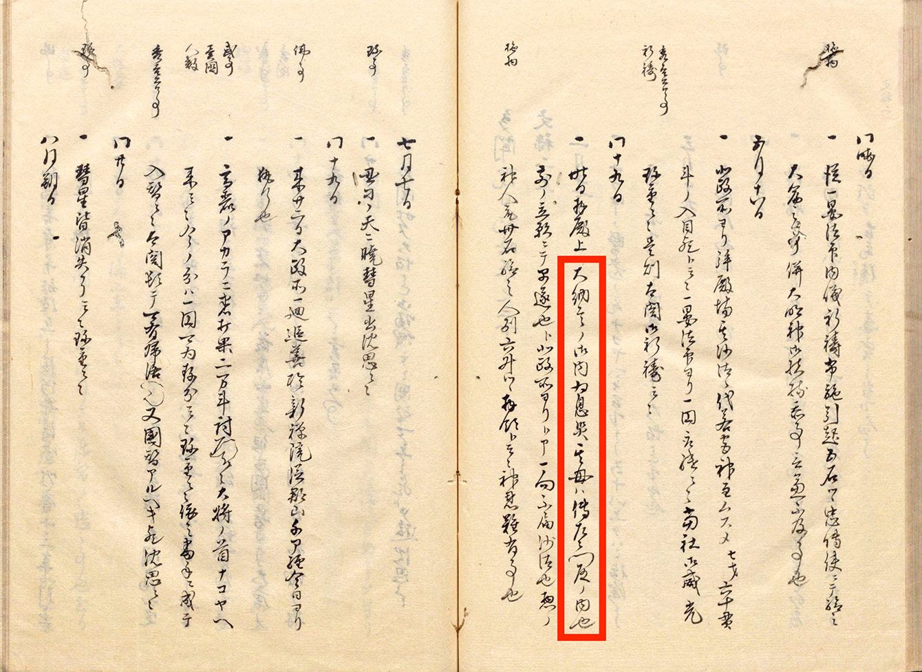 『多聞院日記』文禄2(1593)年5月19日の章。「大納言の御内は息災、母は伝左衛門の内也」とある(国立公文書館所蔵)