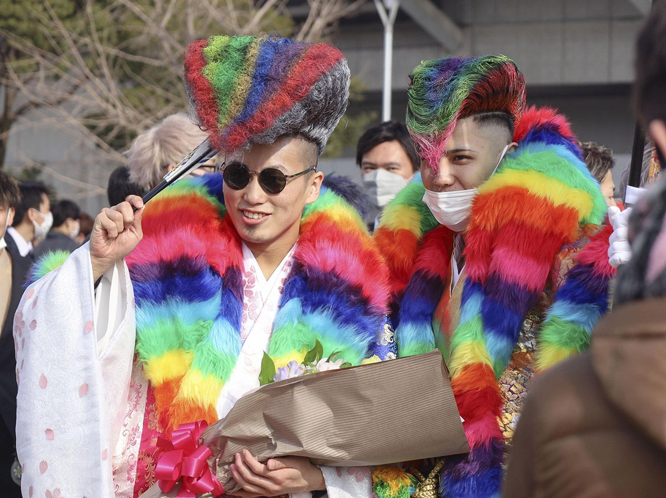 成人式の会場に集まった新成人たち=2022年1月9日午前、北九州市