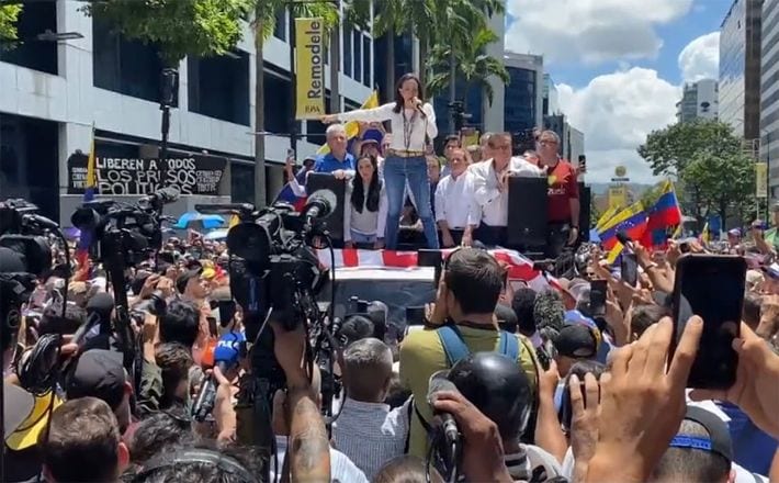 2024年8月28日、ベネズエラ抗議デモで国民に演説するマチャド氏(写真=VOA/CC-PD-Mark/
