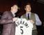 米大リーグ、ホワイトソックスの入団記者会見でユニホームを手にする村上宗隆内野手。左はゲッツ・ゼネラルマネジャー=2025年12月22日、シカゴ