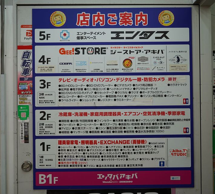 オノデンの店内案内表。1階にはフィギュアやインバウンド向けのお土産なども販売されているが、2~3階で販売している家電はオーソドックスなものが多い。4階にはメイドカフェやグッズショップ、5階にはイベントスペースが入っている