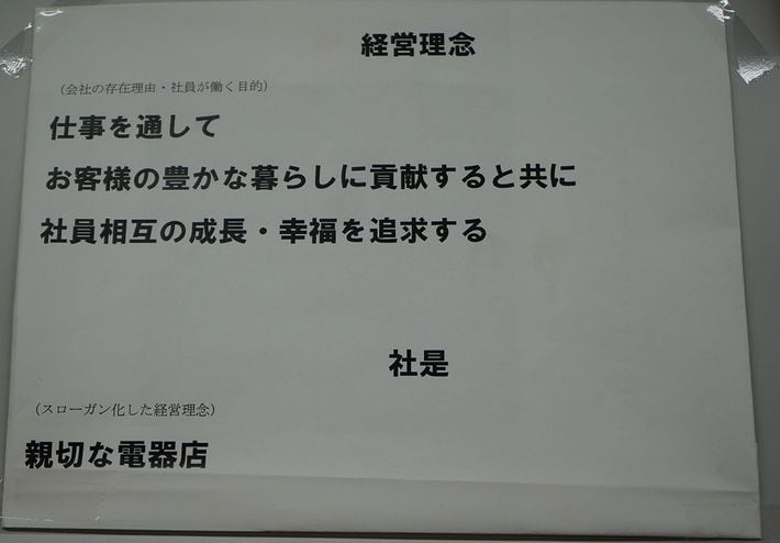 オノデンの会議室の壁に貼られている「経営理念」と「社是」。「親切な電器店」は社是として掲げられている