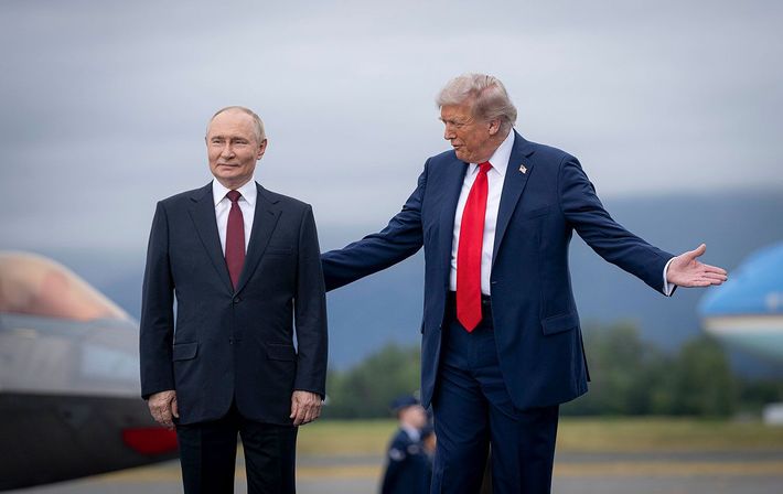 2025年8月15日、アンカレッジのエルメンドルフ・リチャードソン統合基地で、プーチン大統領を迎えたトランプ大統領(写真=Benjamin D Applebaum/米国国防総省/PD US Military/